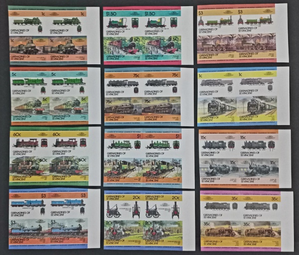 • Grenadines de São Vicente 1994 - FERROVIAS, série completa de 24 valores em quadras SEM DENTEAÇÃO, sem carimbo com goma perfeita! São 48 selos no total!