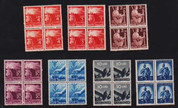 • Itália - Série de 7 selos regulares em quadras sem carimbo com goma perfeita!
