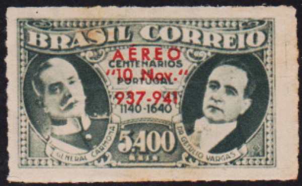 • Brasil 1942 - Getúlio e Carmona, selo aéreo sem carimbo com a variedade catalogada `Colarinho branco em Carmona`!