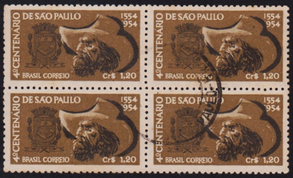• Brasil 1954 - Bandeirante, selo comemorativo em quadra carimbada com variedade catalogada `954 no lugar de 1954`!