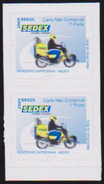 • Brasil 2009 - Selo regular SEDEX em par vertical sem carimbo autocolante com variedade de cor amarela deslocada!