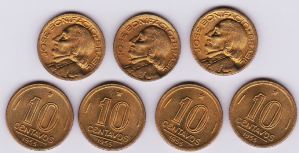 • Brasil 1955 - Seleção de 7 moedas de bronze alumínio no valor de 10 centavos com efígie de José Bonifácio em estado flor de cunho. Moedas nunca circuladas ou usadas!