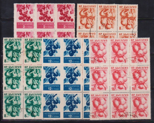 • Bulgária 1967 - Frutas, série completa em quadras sem carimbo com goma!