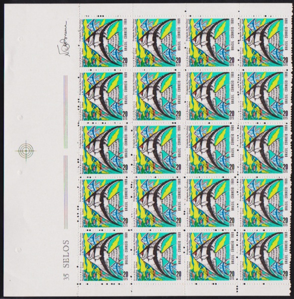 • Brasil 1969 - Peixe Acará Bandeira, parte de folha com 20 selos sem carimbo e emitido sem goma!