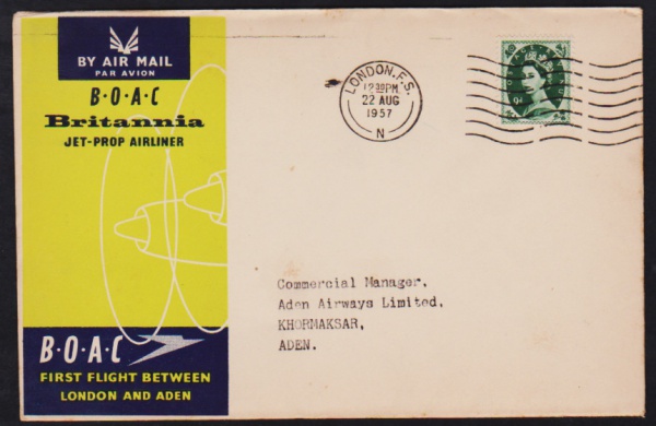 • Inglaterra 1957 - (VOO LONDRES - ADEN) Envelope oficia da British Overseas Airways Corporation (BOAC) voado em primeiro voo com selos e carimbos do voo e de circulação!