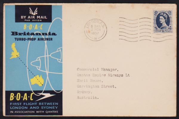 • Inglaterra 1957 - (VOO LONDRES - SIDNEY) Envelope oficia da British Overseas Airways Corporation (BOAC) voado em primeiro voo com selos e carimbos do voo e de circulação!