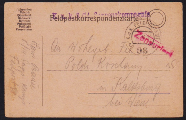 • Áustria 1916 - Cartão FELDPOST (Correspondência de Guerra) circulada com carimbos de censura!