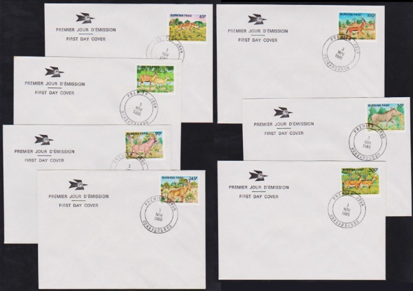 • Burkina Faso 1986 - FAUNA.  Série completa de 7 envelopes com selos e carimbos!