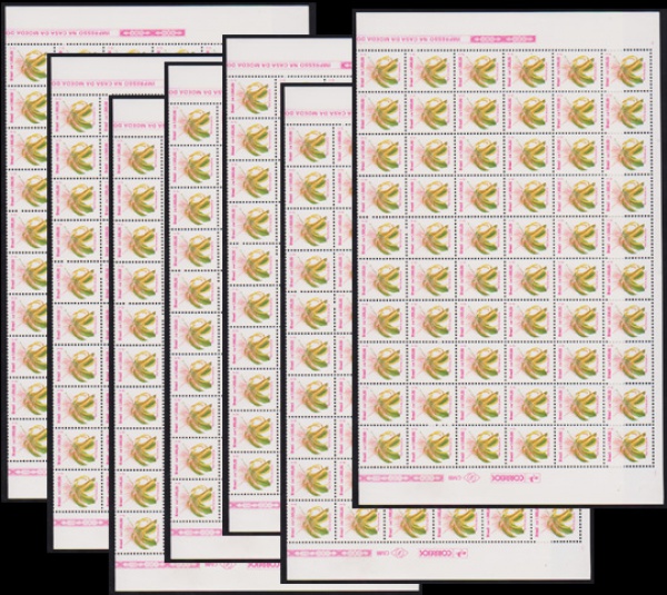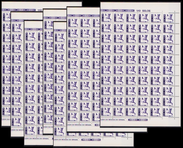• Brasil 1982 - Selo regular no valor de 2 Cruzeiros, Coco, seleção de 7 folhas completas de 110 selos cada, todas sem carimbo com goma! Catálogo RHM 602. Valor de catálogo em R$ 1.540,00!