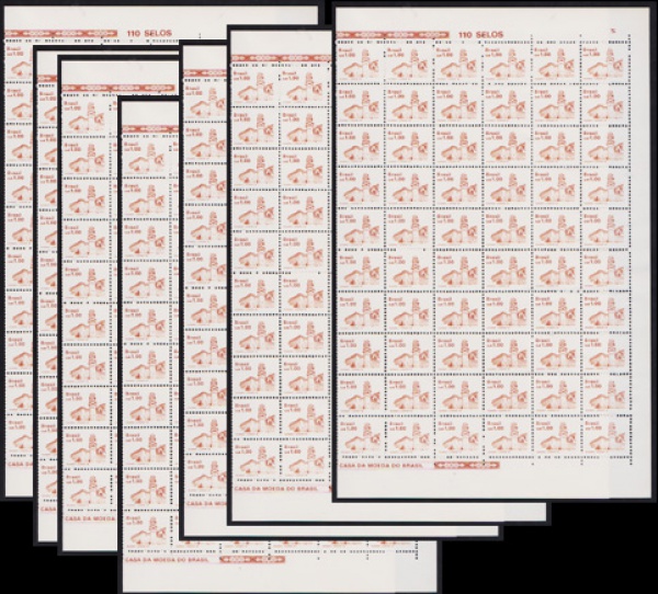 • Brasil 1990 - Selo regular no valor de 50 Cruzados, Sombreiro, seleção de 7 folhas completas de 110 selos cada, todas sem carimbo com goma perfeita! Catálogo RHM 681. Valor de catálogo em R$ 1.540,00!